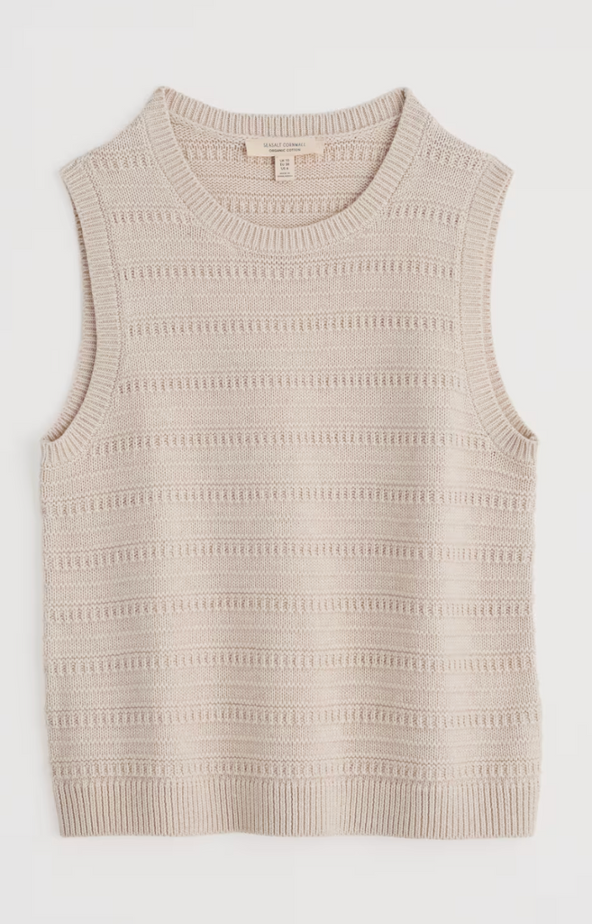 A mid weight round-neck knitted vest in soft, breathable organic cotton with a horizontal ribbed stitch pattern and ribbed edges. Designed to last through the seasons, it can be worn with and without a layer underneath. We love it over dresses or shirts, or worn alone with comfy jeans.